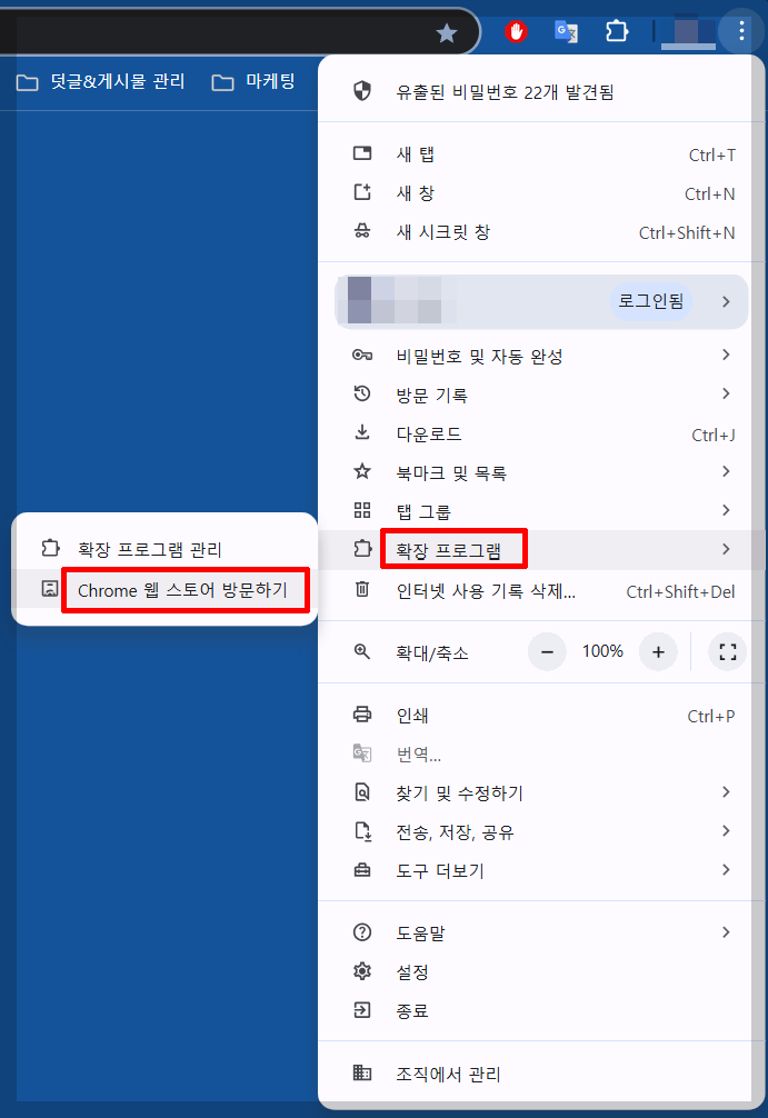 ▼우측 메뉴(점 세개) 클릭해서 [확장 프로그램] - [웹스토어 방문]