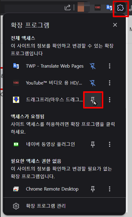 ▼확장 프로그램 더보기를 클릭해서 상단바에 '고정' 시킨다. 단축키 설정해놓고 단축키로만 쓰실 분들은 고정하지 않아도 된다.
