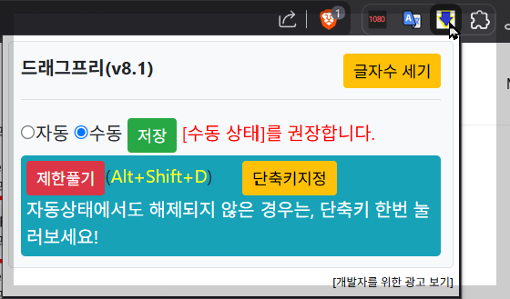 ▼상단에 고정된 드래그프리 클릭하고 '제한풀기' 누르면 현재 페이지의 드래그 및 우클릭 방지가 해제된다.