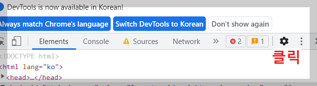 ▽ 크롬에서 F12를 눌러 DevTool을 활성화 한 후 설정(톱니바퀴) 아이콘 클릭.