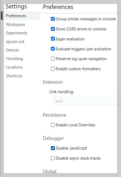 ▽ Preferences 탭에서 쭉 내리다보면 Debugger 항목의 Disable JavaScript 항목 체크.
