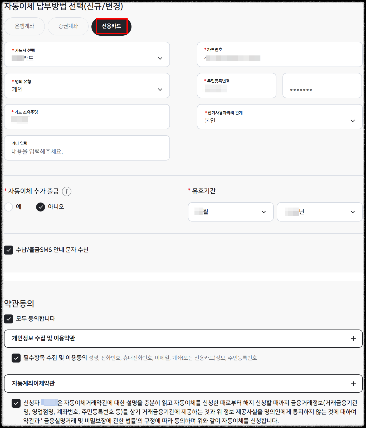 ▼ 저는 신용카드로 자동결제를 원해서 신용카드 선택 후 정보 입력해 줍니다.