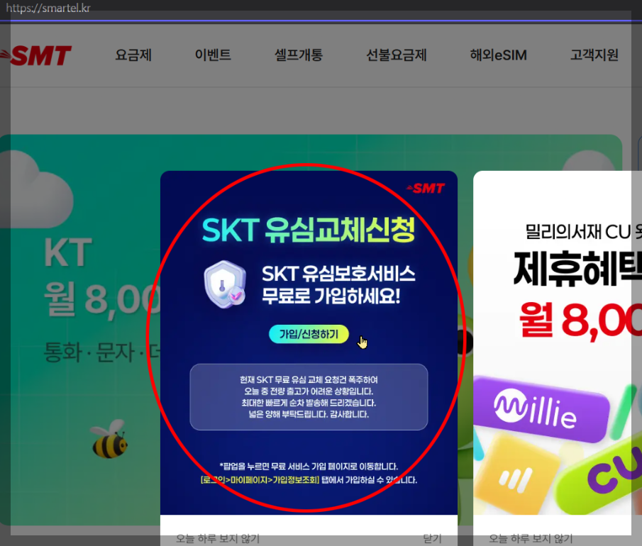 ▼ 스마텔 홈페이지 접속하면 배너가 뜨는데, 클릭하시고 로그인 하시고 안내에 따라 진행하시면 됩니다