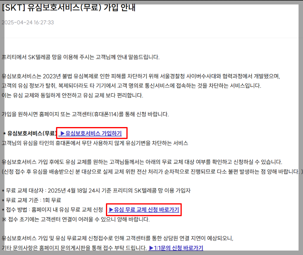 - 유심 무료 교체 대상: 2025년 4월 18일 24시 기준 SK텔레콤 및 해당 망을 사용하는 알뜰폰 이용자