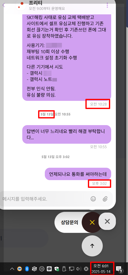 - 톡 상담: 오전 10시부터 상담 요청을 했으나 다음날까지도 답변이 없는 상태