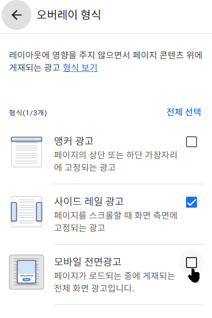 애드센스의 광고 설정에 들어가보면 아래와 같이 '모바일 전면광고' 체크옵션이 나오는데 이걸 체크해제 하지 않으면 2025년 9월 3일부터 블로그가 규제 대상이 됩니다.