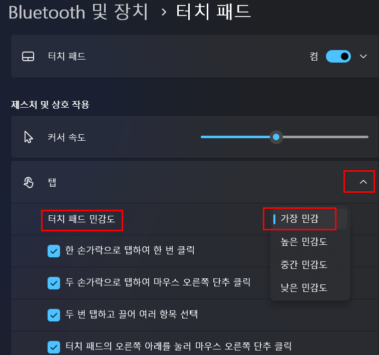 ↓ '탭' 항목의 꺾쇠를 클릭해 하위메뉴를 펼친 다음, 민감도를 '가장 민감' 으로 변경하세요