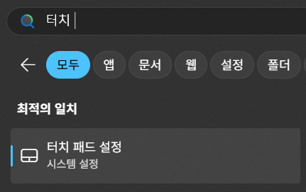↓ 윈도우 기준 설명입니다. 시작메뉴에서 '터치 패드 설정' 검색해서 들어가 주시구요... '터치' 라고만 검색해도 맨 위에 뜸.