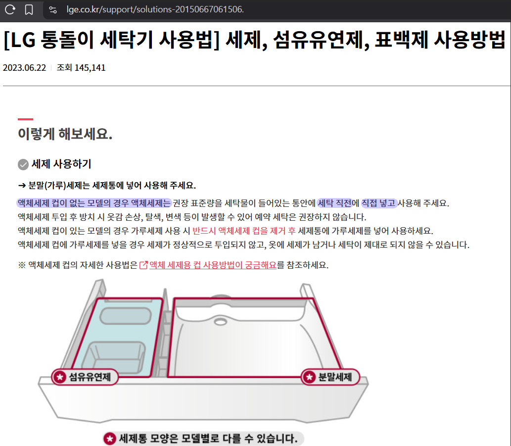 ⬇LG 공식 답변에 따르면 제 세탁기처럼 액체세제용 컵이 따로 없으면 세탁 직전 세탁조에 직접뿌리라고 되어 있었어요...