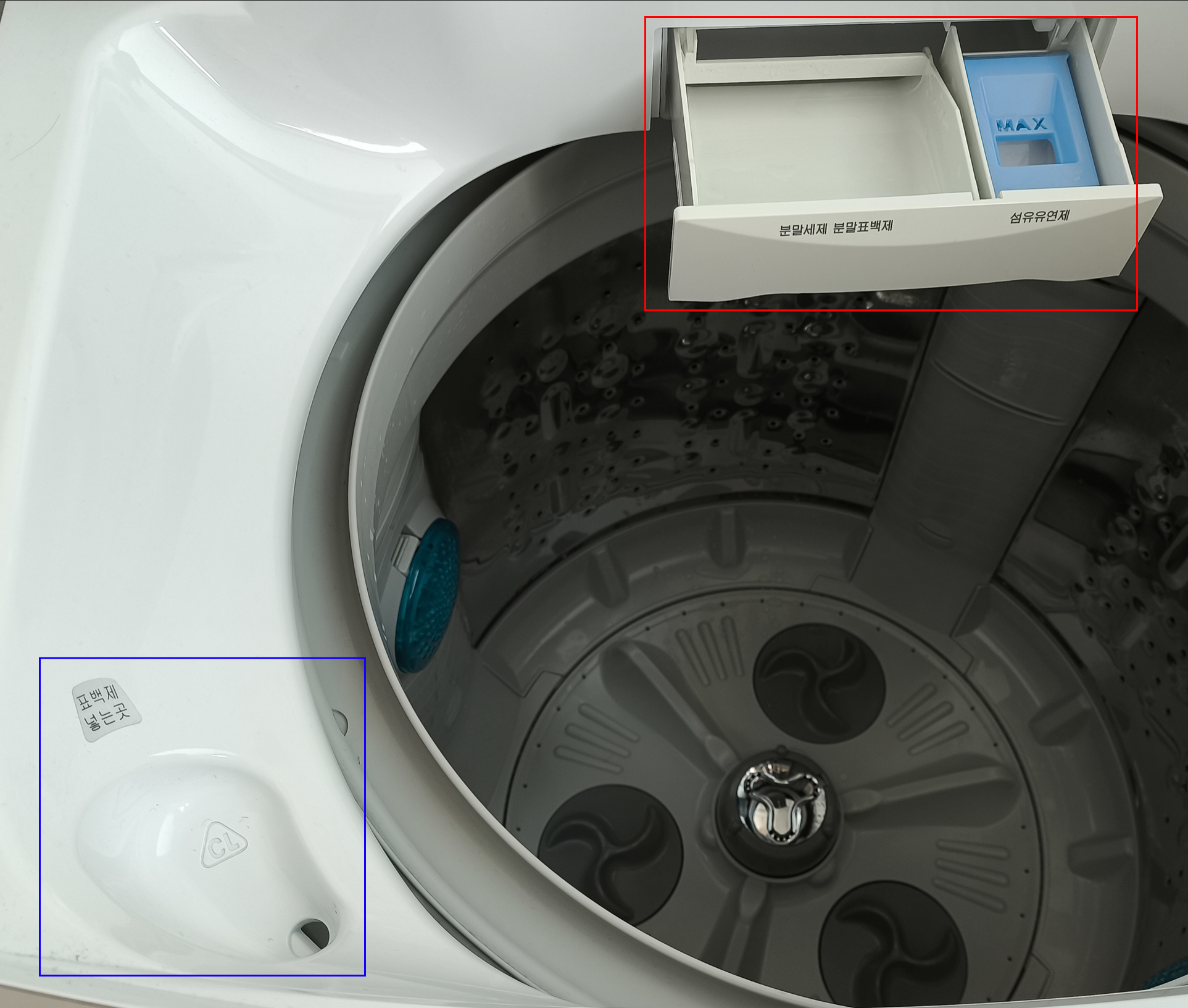 그다음 파란박스 표시 부분에는 표백제 넣는곳 이라고 되어있는데요, 제가 지금까지 액상세제를 저기에 넣고 세탁을 했어요. 그것도 몇년동안😞